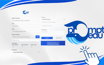 PromptEdu, öğretmenlerin ders materyalleri ve değerlendirme soruları hazırlamasını kolaylaştıran bir Chrome eklentisidir. Kullanıcı dostu arayüzü sayesinde öğretim programı, sınıf, konu ve öğrenme çıktıları gibi bilgileri hızlıca girebilir ve ihtiyaç duydukları soru türlerini ve kriterleri seçebilirler. "Prompt Oluştur" butonuyla önizleme yaparak, içeriklerini kopyalayabilir veya OpenAI ile optimize edebilirler.